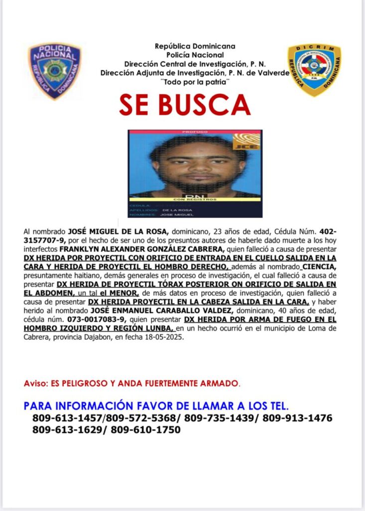 Los autores de este múltiple crimen fueron identificados como José Miguel de la Rosa, de 23 años, con antecedentes penales y orden de arresto pendiente; Héctor Alejandro Acevedo Estévez (a) “Chico”, residente en el sector Pinal Claro, también prófugo; y un tercero apodado “Fenbo”, cuya identidad completa continúa bajo verificación.
